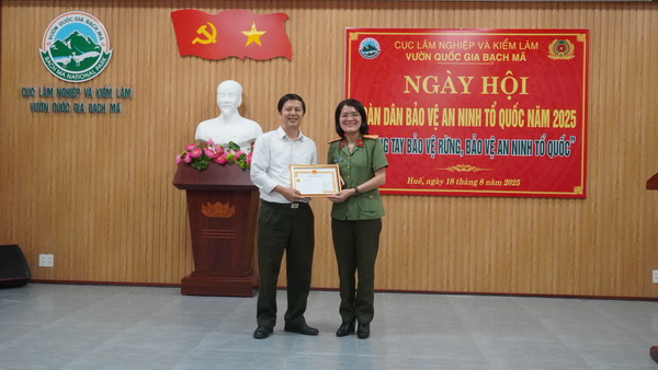 Đại diện Công an TP Huế đã trao quyết định khen thưởng của Giám đốc công an thành phố cho tập thể Vườn quốc gia Bạch Mã đã có thành tích xuất sắc trong thực hiện công tác xây dựng phong trào toàn dân bảo vệ an ninh Tổ quốc năm 2025.