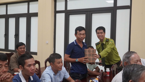 Đồng chí Nguyễn Vũ Linh, Giám đốc VQG Bạch Mã trao quà cho các hộ nhận khoán bảo vệ rừng tiêu biểu