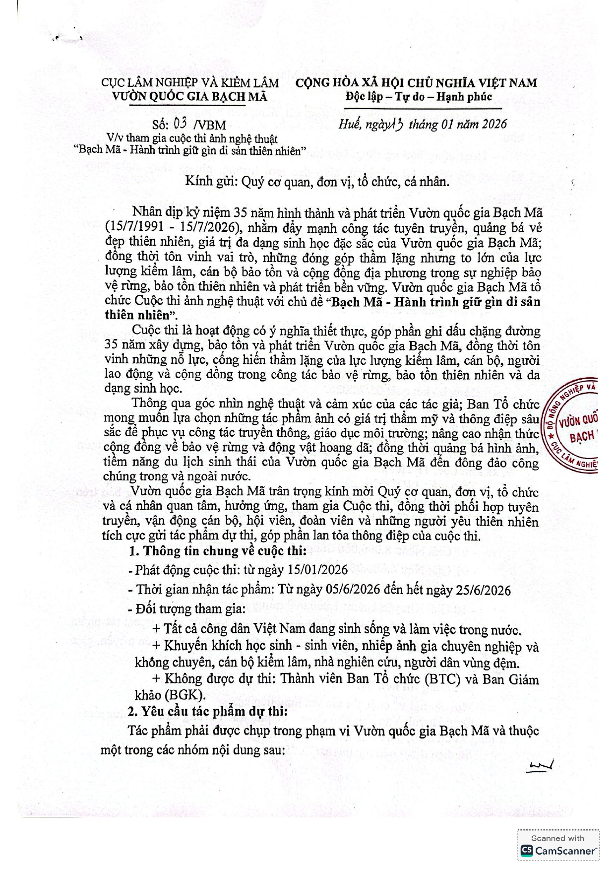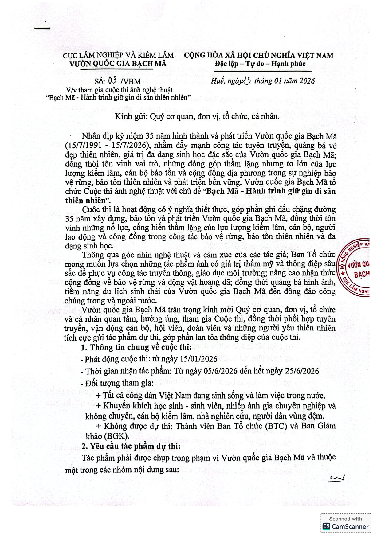Bạn yêu thiên nhiên, đam mê nhiếp ảnh và mong muốn lan tỏa thông điệp bảo tồn? Hãy tham gia ngay cuộc thi ảnh nghệ thuật về Vườn quốc gia Bạch Mã – nơi hội tụ vẻ đẹp hoang sơ, đa dạng sinh học và những nỗ lực bền bỉ của con người trong gìn giữ rừng xanh.