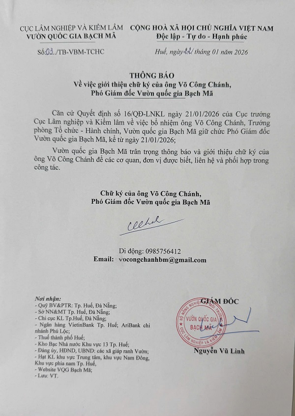 Về việc giới thiệu chữ ký ông Võ Công Chánh - Phó giám đốc VQG Bạch Mã